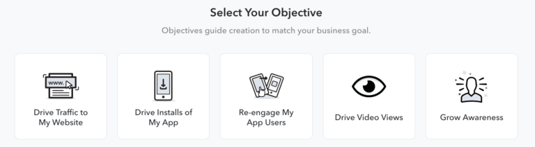 The creation of a Snapchat advertisement starts as on Facebook, you first choose a goal before designing your advertisement: acquisition of traffic, application installation, retargeting application users, acquiring views on a video, improvement of the reputation