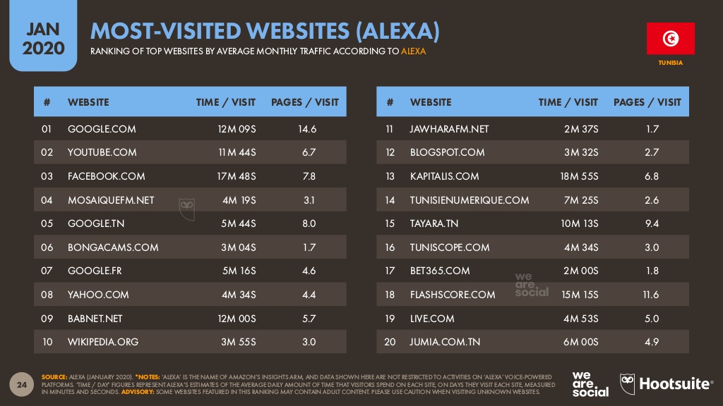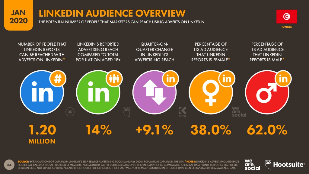 La pénétration des médias sociaux en Tunisie était de 62% en janvier 2020.