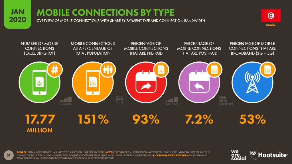Il y avait 17,77 millions de connexions mobiles en Tunisie en janvier 2020.
