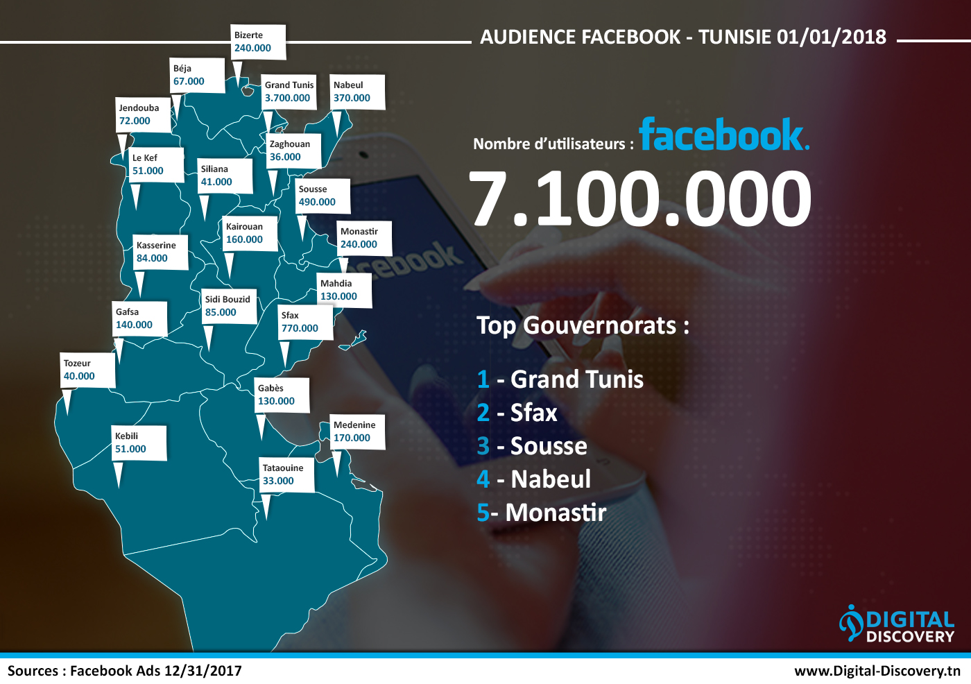Nombre d’utilisateurs Facebook en Tunisie par gouvernorat :
