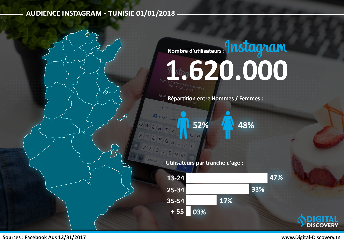 Pour instagram, en Tunisie, nous assistons à une égalité entre hommes et femmes présents sur cette application. On constate une majorité de 13-24 ans présentes sur l’application d’instagram.