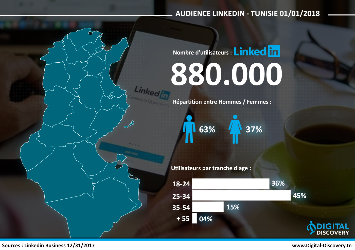 Avec 880 000 utilisateurs tunisiens, Linkedin est légèrement favorisé par les Hommes qui représentent 63% des utilisateurs actifs.