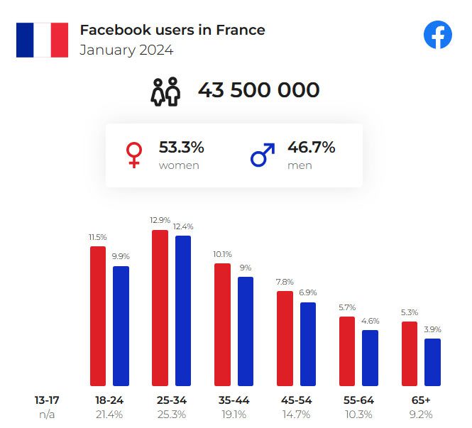 La plateforme sociale emblématique, Facebook, continuait de jouer un rôle central dans la vie numérique des Français en janvier 2024, avec une impressionnante base de 43 500 000 utilisateurs, soit 65,2 % de la population totale.