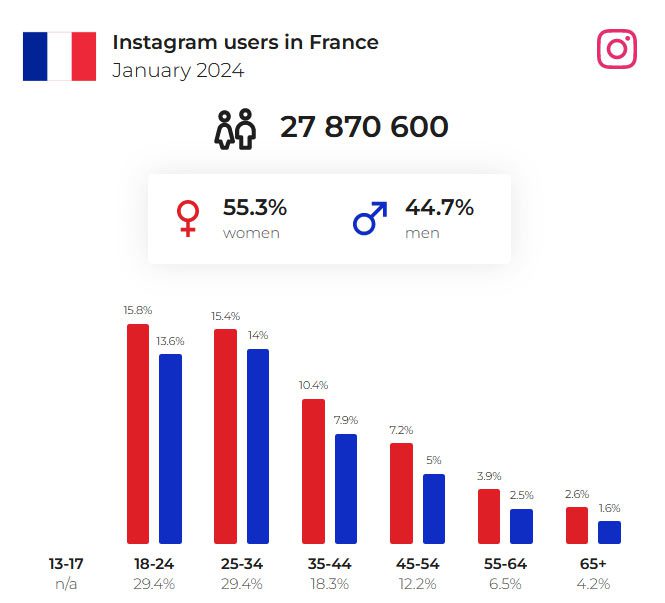 En janvier 2024, la plateforme visuelle Instagram captivait 27 870 600 utilisateurs en France, représentant 41,8 % de la population totale.