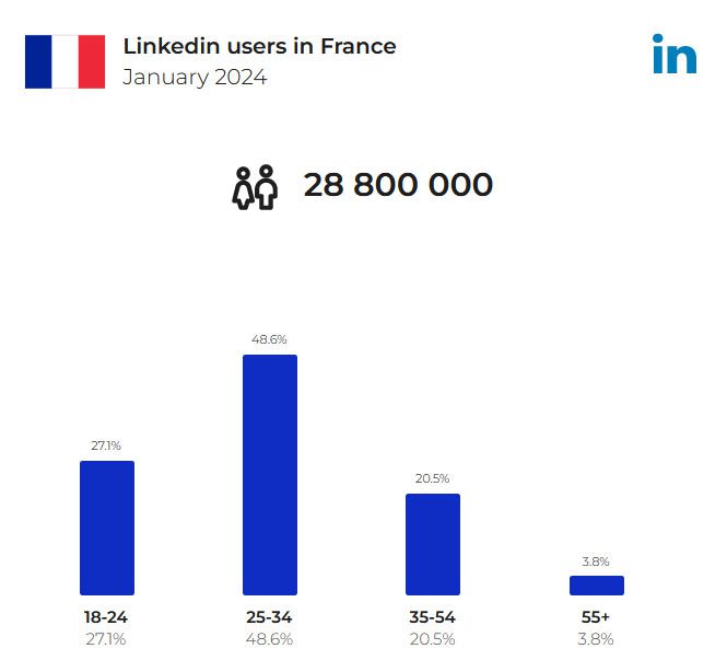 En janvier 2024, Linkedin, la plateforme professionnelle par excellence, comptait 28 800 000 utilisateurs en France, représentant 43,2 % de la population totale.