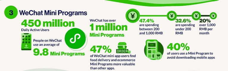 Ces applications intégrées à WeChat offrent aux utilisateurs une expérience tout-en-un (achats en ligne, recherche d’informations, jeux vidéo, etc.) et permettent aux entreprises de mener des campagnes promotionnelles.