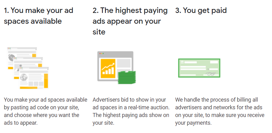 Avec Adsense de Google, les éditeurs de sites web peuvent ajouter des blocs de publicités sur leur site en définissant les paramètres sur Adsense. En ajoutant un petit code sur leur site, tout est automatisé sans nécessiter d’intervention. Les publicités affichées peuvent être liées au contenu du site ou ciblées pour le visiteur via le remarketing.