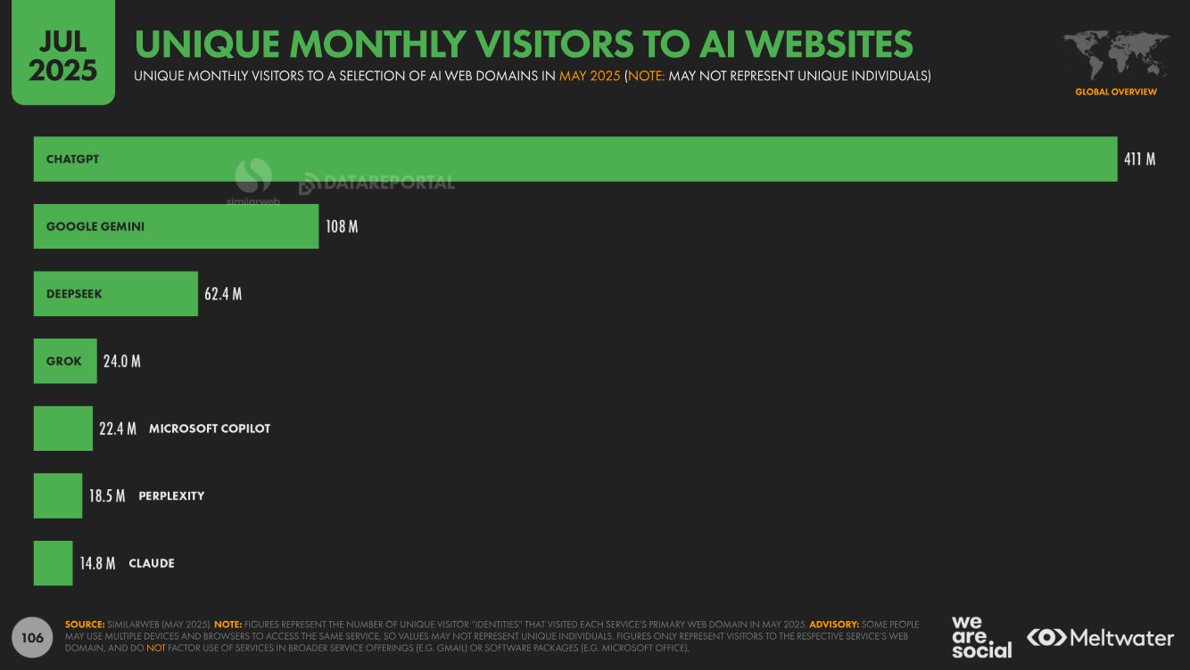 ChatGPT attire désormais plus d’un milliard de visites hebdomadaires, avec 411 millions de visiteurs uniques en mai 2025 (+62% vs mai 2024). Cette croissance illustre la transition vers les interfaces conversationnelles.