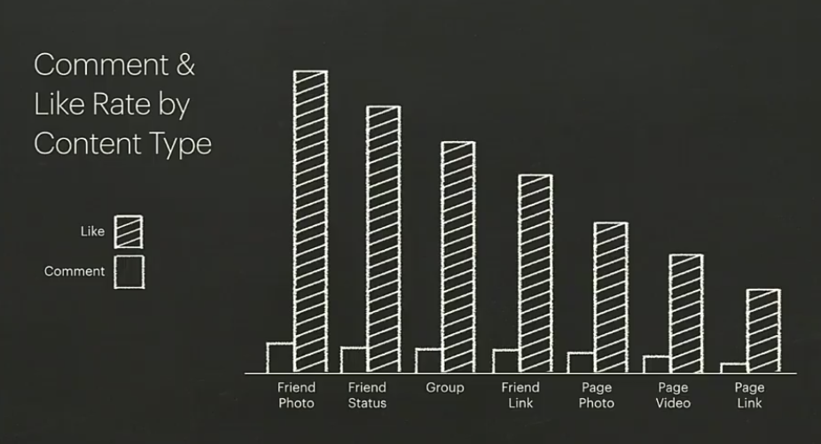 As defined by Mosseri: “Friend posts facilitate more comments, per impression, than group posts, which do more so per impression than Page posts. Links tend to be less good for conversation than photos. Because of this, certain things are going to do more well in ranking and certain things less well in ranking, and we see the composition of News Feed shift.”