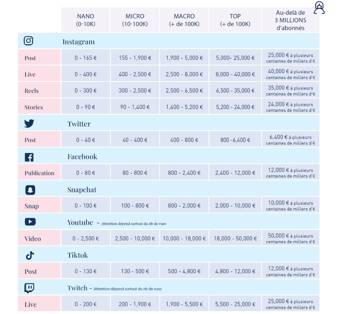 Découvrez combien les influenceurs facturent en 2023 et ce qu’ils peuvent gagner grâce aux campagnes de marketing d’influence. Calculez les taux d’influence moyens et le prix par coût de publication pour Instagram, Youtube, TikTok, Snap ou Twitter.