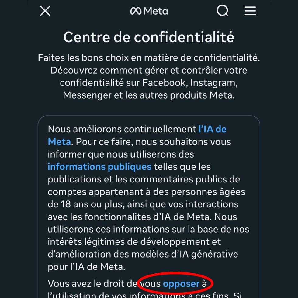 Le 27 mai ne constitue pas une date butoir définitive : les formulaires resteront accessibles au-delà, mais une fraction de vos informations aura déjà été captée par l’entreprise. L’objection ne pourra donc pas effacer rétroactivement les données déjà récoltées. Par ailleurs, même après opposition, le risque d’exposition subsiste partiellement. Meta l’admet explicitement dans ses conditions d’utilisation : “Il est possible que nous continuions à exploiter des informations vous concernant pour concevoir et perfectionner le service IA de Meta, y compris en cas d’opposition de votre part ou de non-utilisation de nos produits.” Cette situation peut notamment se présenter dans deux circonstances : votre présence sur un cliché diffusé par un autre membre ou votre mention dans une publication, une description ou un commentaire public rédigé par un tiers.
