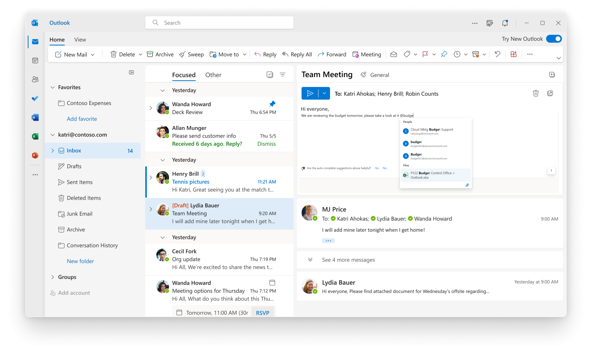 Trouver le document que vous souhaitez joindre à un message peut être délicat si vous ne vous souvenez pas où vous l’avez enregistré. Le nouvel Outlook peut vous aider à gagner du temps et à le faire rapidement. Dans Outlook, vous pouvez déjà @mentionner quelqu’un pour l’ajouter à un message électronique et vous pourrez désormais faire de même pour les @fichiers et les @documents tant qu’ils sont stockés dans le cloud. Juste @thenameofthefile et Outlook vous montreront des options.
