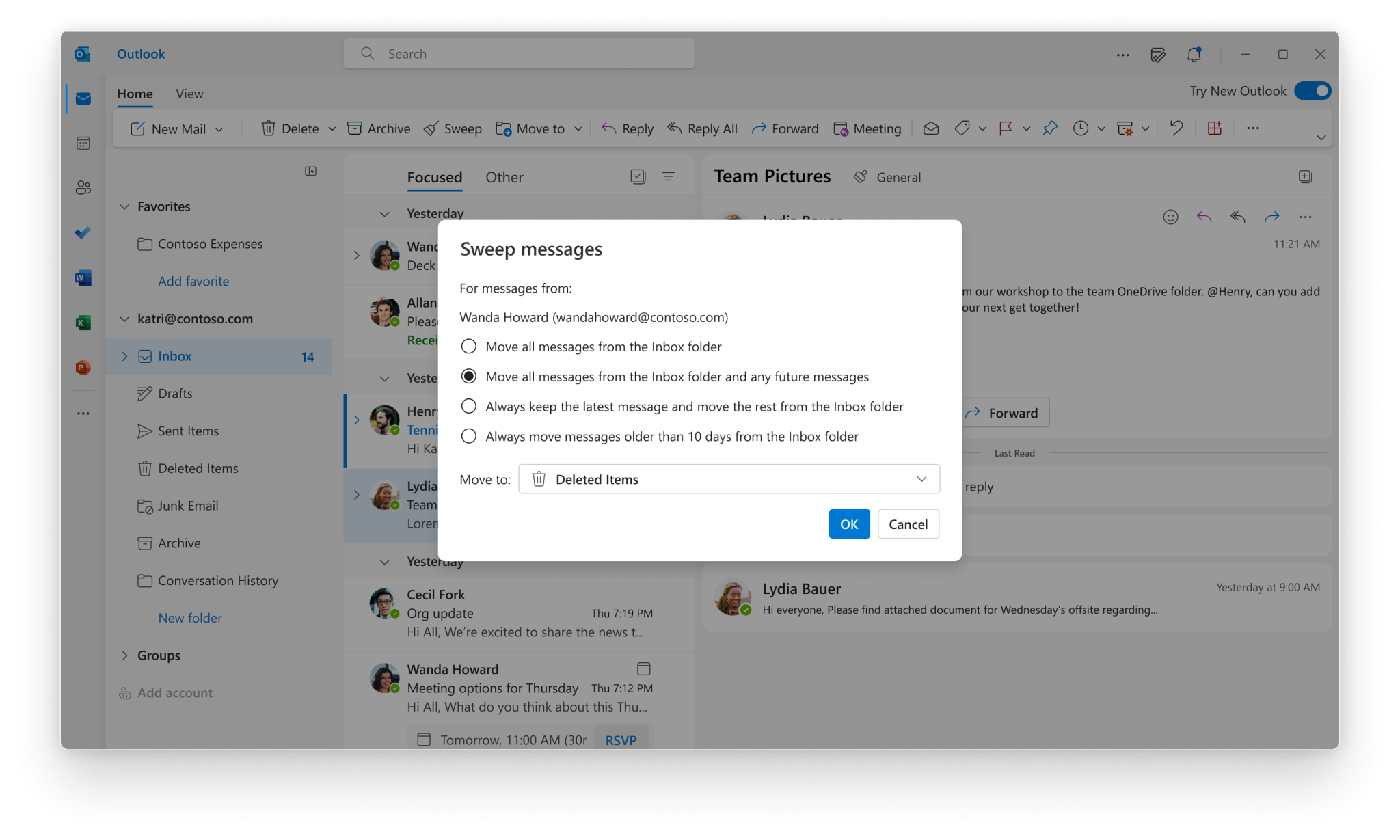 L’une des meilleures façons de contrôler votre boîte de réception est de la garder propre et de prioriser les messages. Le nouvel Outlook a plus de règles pour vous aider à automatiser votre boîte de réception et Sweep est un moyen simple de le faire. Sweep vous permet de déplacer des e-mails par lots et également d’appliquer des règles aux futurs messages entrants. Supprimer tous les messages provenant de quelqu’un ? Aucun problème! Vous souhaitez ne conserver que ce dernier message promotionnel, c’est fait !