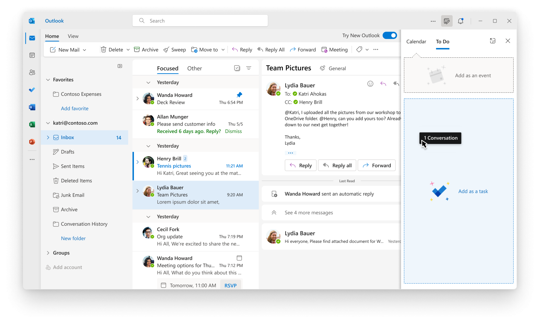 My Day vous aide à rester dans le flux de votre travail tout en vous connectant à ce qui est important. Avec les nouveaux Outlook pour Windows et My Day, vous pouvez faire glisser et déposer des e-mails en tant que tâches dans votre liste de tâches afin de pouvoir revenir au message à un moment plus opportun. Vous pouvez même utiliser My Day pour réserver du temps dans votre calendrier pour effectuer ces tâches, il suffit de faire glisser et de déposer une tâche dans le calendrier.