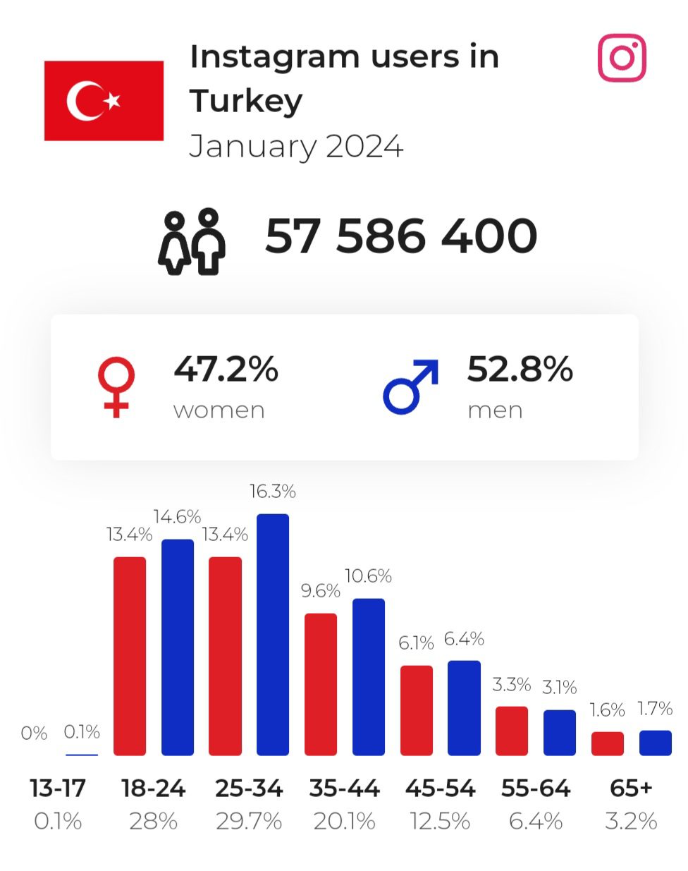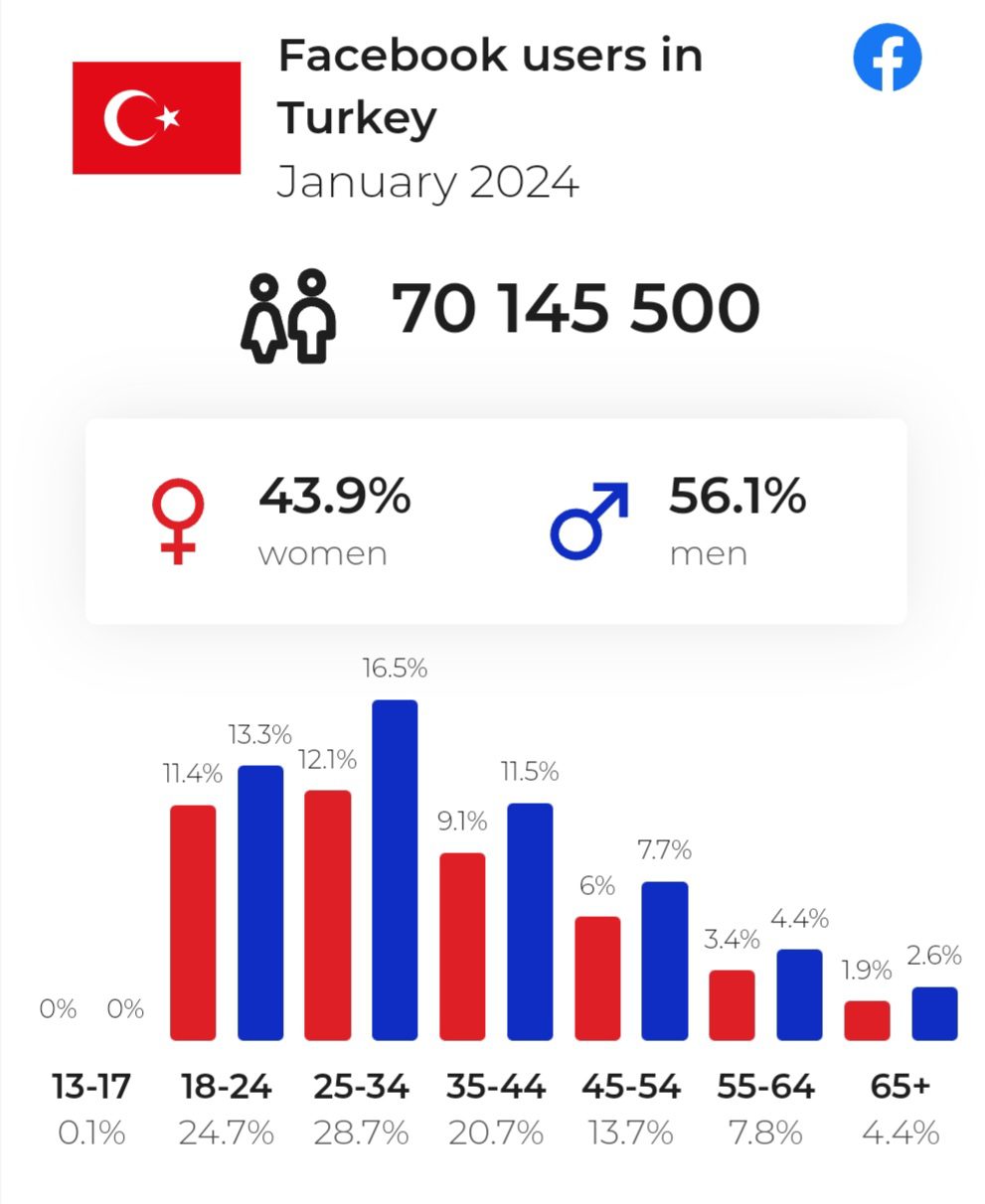 Facebook continues to reign supreme in Turkey, capturing the attention of a staggering 70,145,500 users, which accounts for a remarkable 81.8% of the country’s entire population. Among these users, 56.1% are men, and the largest demographic falls within the age group of 25 to 34, comprising a notable 20,100,000 individuals. Intriguingly, within this age group, men lead by a considerable margin of 11,600,000.