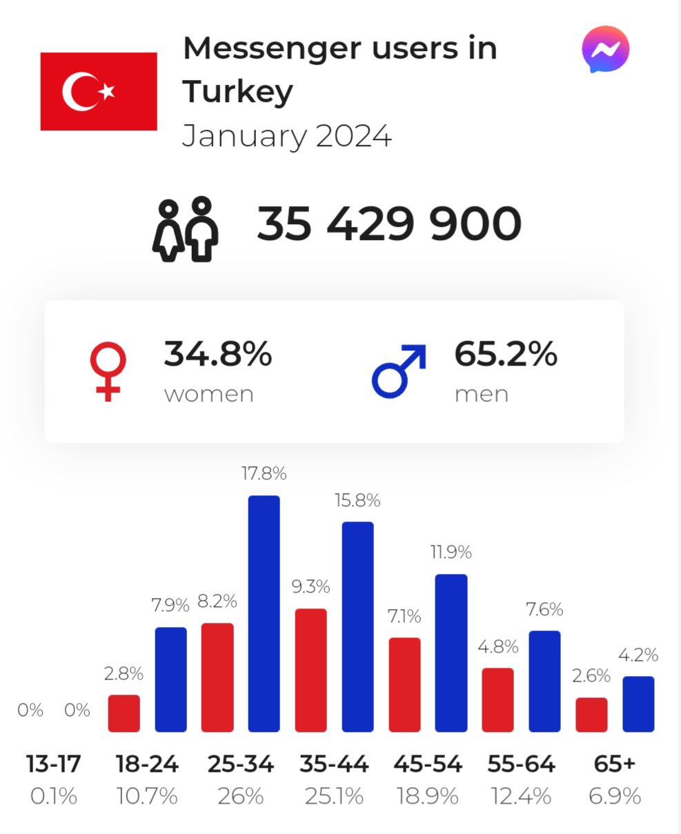 Messenger continues to be a go-to platform for communication in Turkey, with 35,429,900 users, making up 41.3% of the population. A significant majority, 65.2%, are men, and the largest user group is aged 25 to 34, comprising 9,200,000 individuals. Within this age range, men lead by an impressive margin of 6,300,000.