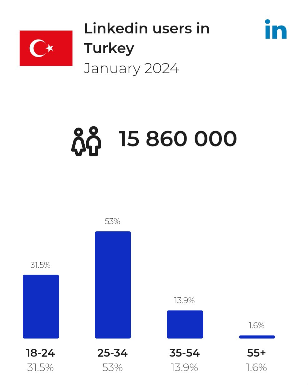 LinkedIn has carved a niche as the professional network of choice, attracting 15,860,000 users in Turkey, constituting 18.5% of the total population. The largest user group falls within the age range of 25 to 34, encompassing 8,400,000 individuals.