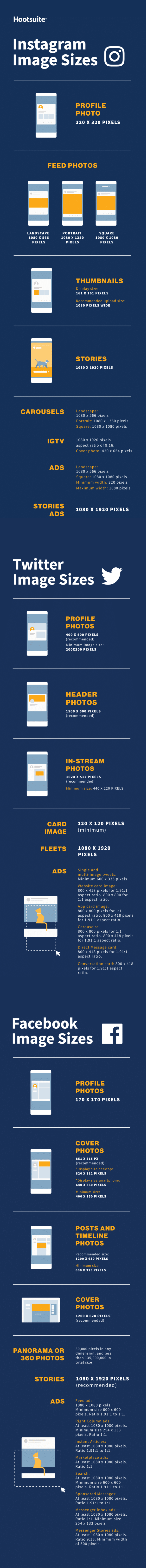 Hootsuite a récemment publié son dernier guide visuel des médias sociaux, qui comprend un aperçu complet des principales exigences de chaque plate-forme. L’équipe Hootsuite a inclus beaucoup plus de détails dans son aperçu complet, mais vous pouvez consulter l’infographie ci-dessous pour les notes clés.
