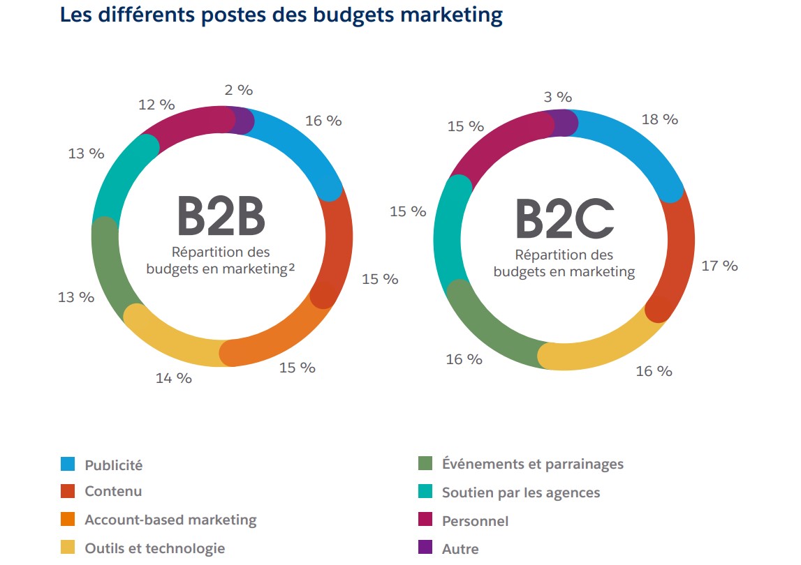 En termes de postes de dépenses, le rapport pointe donc un certain niveau d’investissement technologique, qui peut s’expliquer par les anticipations de ralentissements économiques futurs. La publicité reste un pilier des dépenses marketing à la fois en B2B et en B2C.