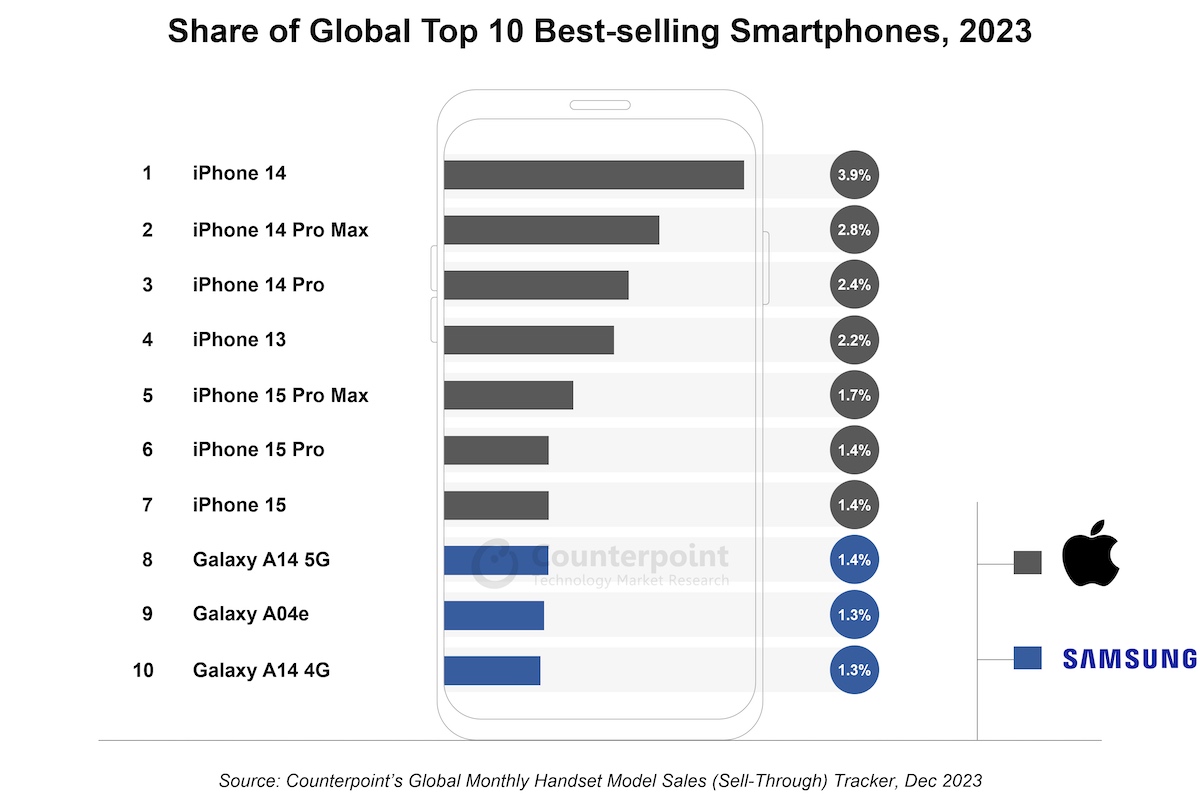 For the first time ever, Apple’s iPhones secured the top seven positions in the ranking of best-selling smartphones in 2023. The top 10 list saw the remaining three spots occupied by Samsung, featuring the Galaxy A models, underscoring the market impact of these two brands.