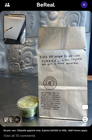 Certaines marques expérimentent BeReal, comme Chipotle, qui utilise l’application pour partager des codes promotionnels exclusifs.