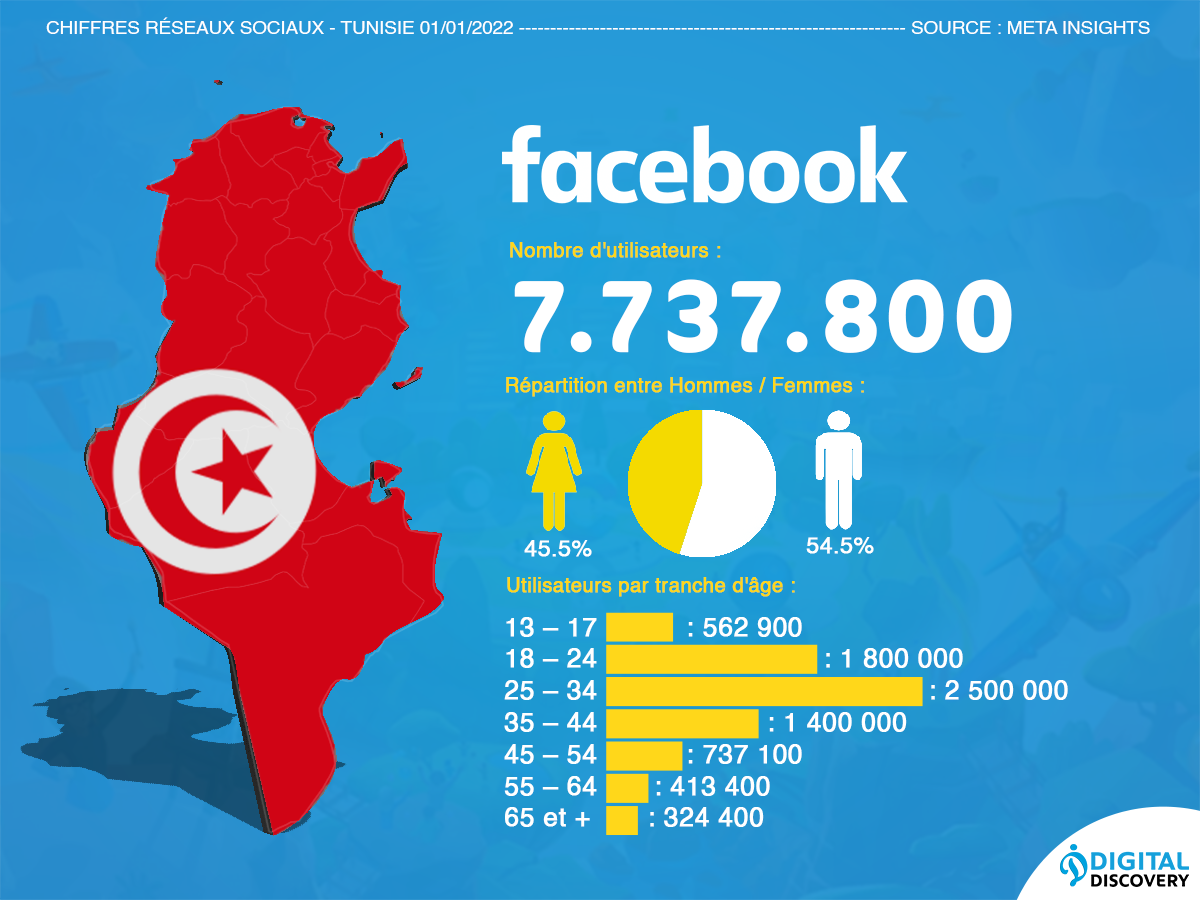En 2022, Facebook a réuni 7 737 000 utilisateurs en Tunisie. C’est le premier réseau social en Tunisie, si l’on ne tient pas compte de Youtube.