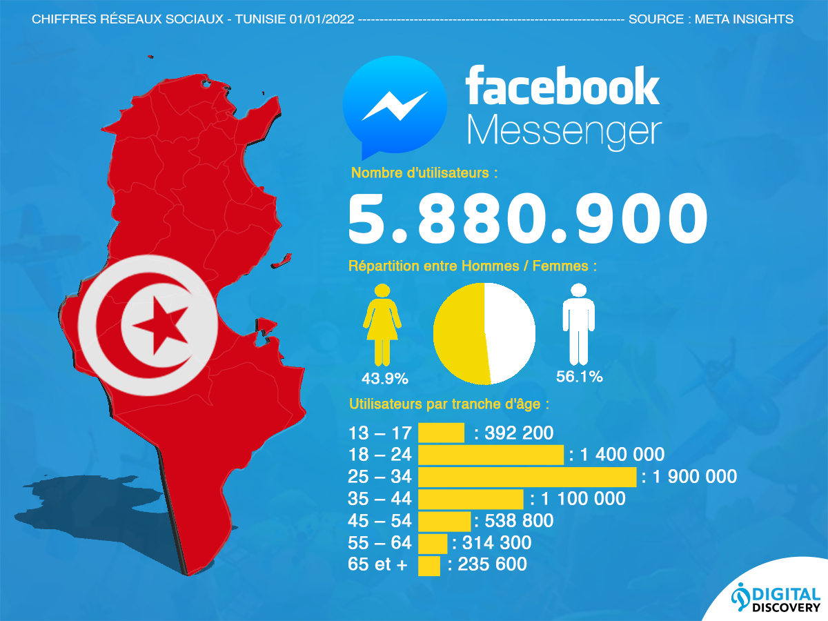 En 2022, Messenger a réuni 5880 900 utilisateurs en Tunisie. C’est le deuxième réseau social en Tunisie.