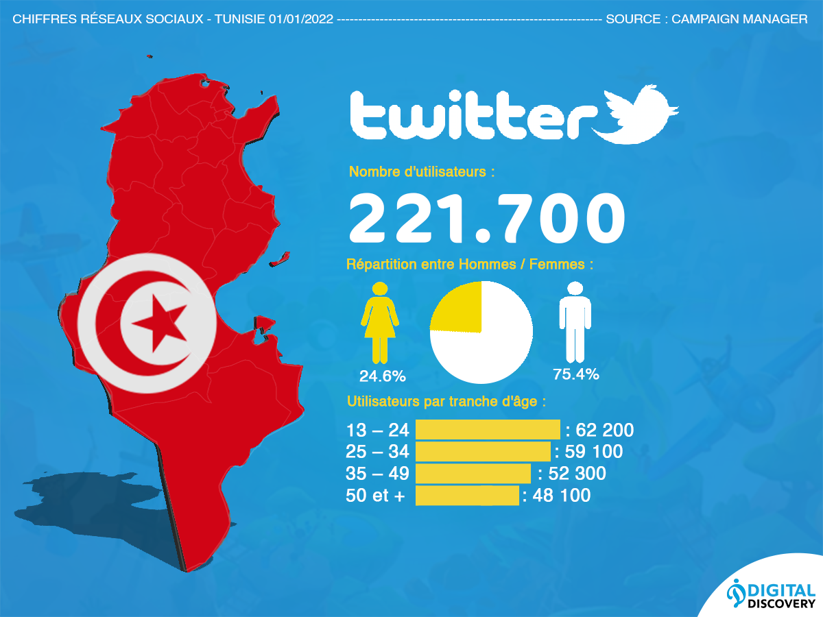 Avec 221 700 d’utilisateurs tunisiens, Twitter n’a pas eu une grande notoriété en Tunisie. Nous comptons 221 700 membres soit 3% de la population uniquement en 2022. Twitter est favorisé par les Hommes , nous avons 24.6% utilisatrices et 75.4% utilisateurs.