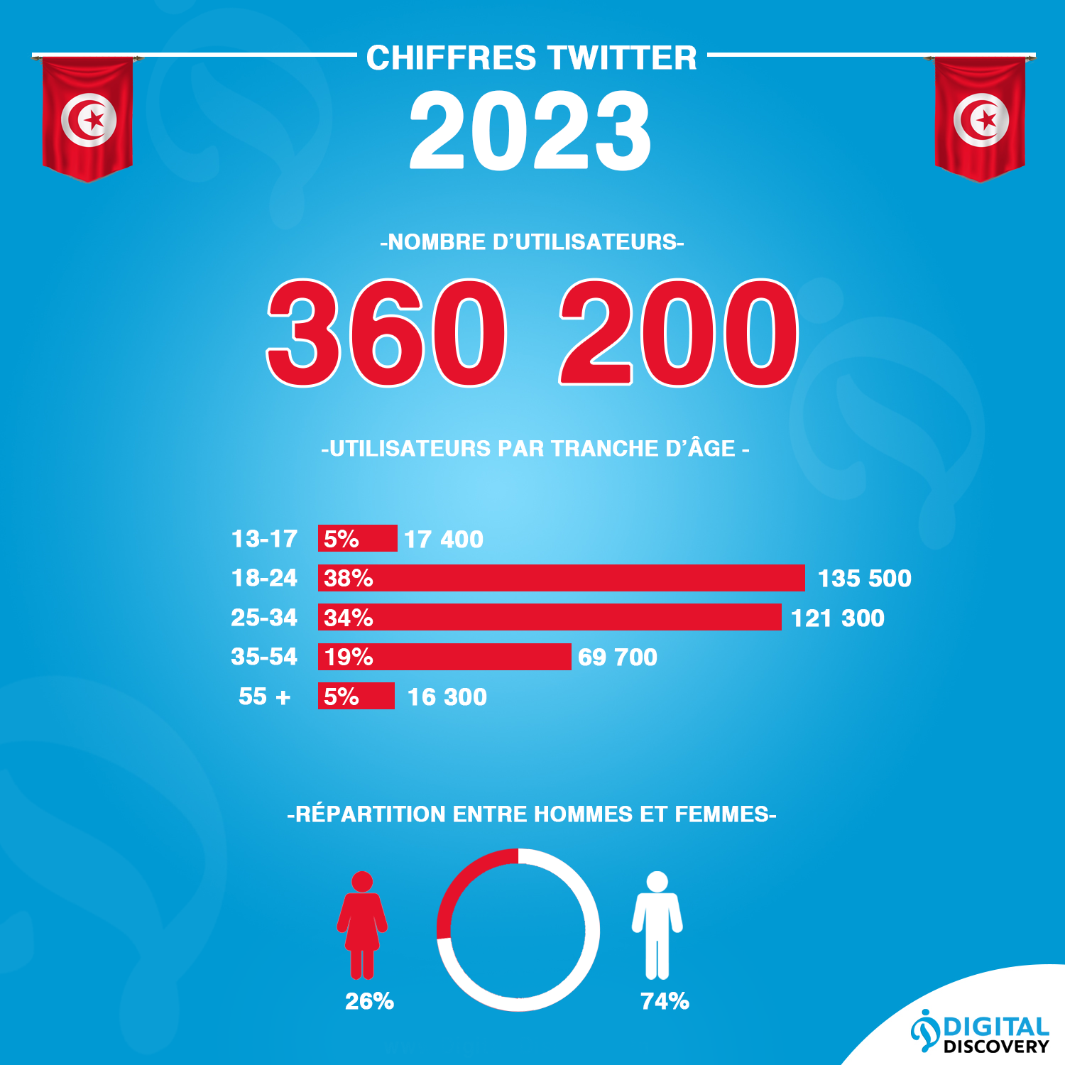 En Tunisie, le réseau social Twitter compte 360 200 utilisateurs. Les 18-34 ans représentent 72% des utilisateurs. Dans le monde, Twitter compte 237,8 millions d’utilisateurs journaliers actifs monétisables. Twitter est favorisé par les Hommes , nous avons 26 % utilisatrices et 74%% utilisateurs.