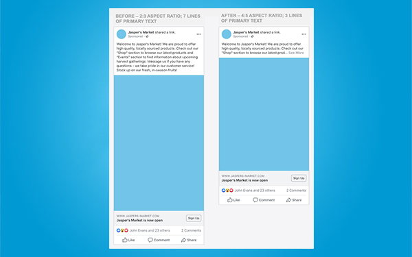 Alors que Facebook affirme que les modifications sont «conçues pour simplifier [ses] formats et améliorer la cohérence de [son] expérience mobile», les professionnels expérimentés du secteur se rappelleront que le format 4: 5 est le rapport hauteur / largeur idéal pour les mobiles, car il permet de maximiser l’immobilier tout en conservant le texte principal et les boutons d’engagement.