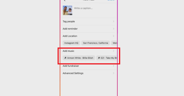 - Puis cliquez sur Suivant pour arriver à l’interface des paramètres du post, et sélectionnez l’option Ajouter de la musique, qui s’affiche en dessous de Ajouter un lieu