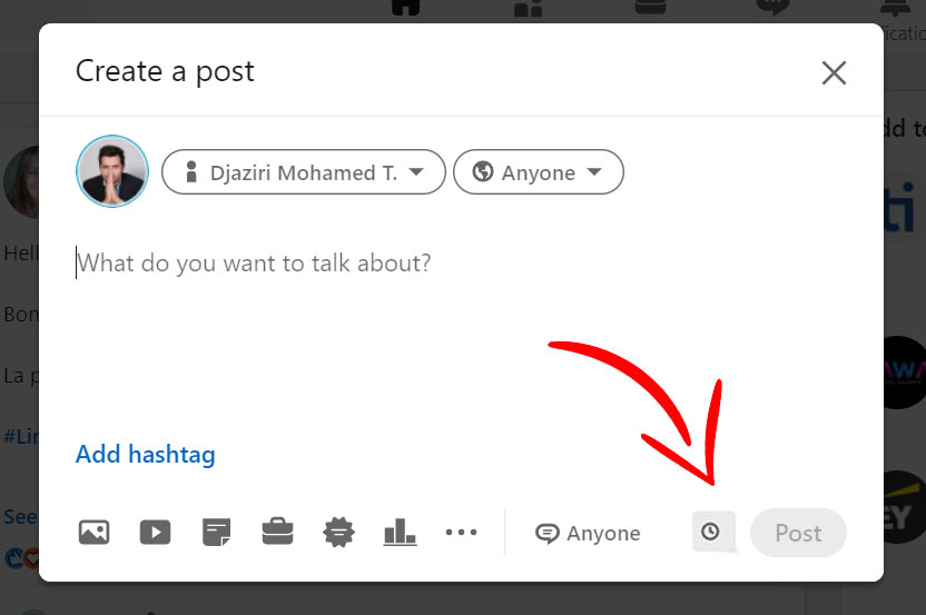 Comme vous pouvez le voir dans cet exemple, partagé par le chercheur d’applications Nima Owji, LinkedIn travaille sur une nouvelle option de planification qui serait intégrée au flux de post-compositeur, avec une nouvelle icône d’horloge ajoutée en bas à droite de la fenêtre.