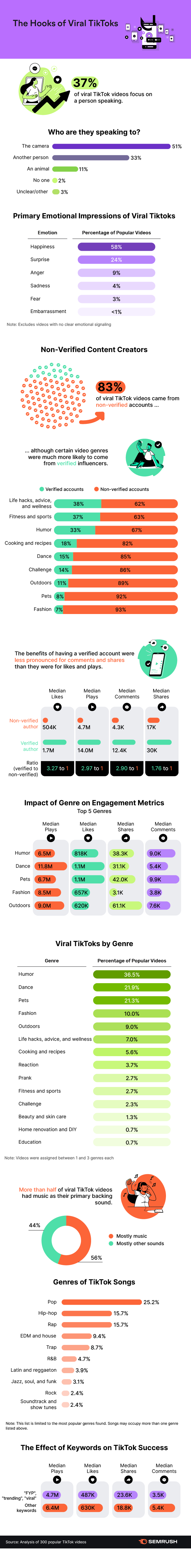 Pour mieux comprendre à quoi les utilisateurs de TikTok répondent, SEMRush a effectué une analyse de 300 des clips TikTok les plus populaires pour mesurer les éléments communs dans chacun, quel impact pourrait être certains hashtags et mots-clés (remarque : TikTok a déjà déclaré que l’ajout de balises telles que « ForYou » et « FYP » n’a aucun impact sur la portée), et la variance de l’engagement entre les utilisateurs vérifiés et non vérifiés, entre autres.