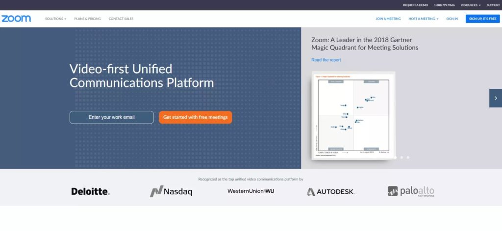 Zoom, comme beaucoup d’autres options ici, est un outil de Visioconférence Web qui propose des plans gratuits et payants. Le compte gratuit avec Zoom possède des fonctionnalités assez robustes, notamment des Visioconférences qui permettent jusqu’à 100 participants, des conférences individuelles illimitées, des conférences vidéo et audio et des fonctionnalités de collaboration de groupe telles que le tableau blanc et le partage d’écran.